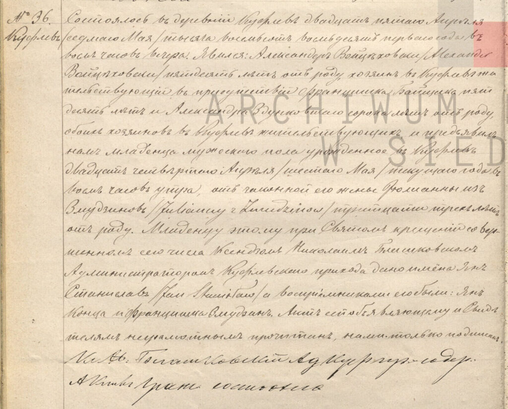 - Język polski (1808–1868) – wprowadzenie Kodeksu Napoleona przyniosło standaryzację akt stanu cywilnego. Dokumenty zaczęto sporządzać po polsku, w ujednoliconej formie, co znacznie ułatwia ich odczytanie. To najłatwiejszy w interpretacji okres dla większości rodzin mazowieckich.